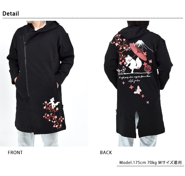 木蓮の花咲く頃斜めジップロング丈裏毛パーカー 今昔 KJ-29252 和柄 和風 狐 キツネ 刺繍 ユニセックス