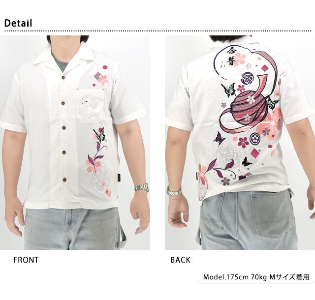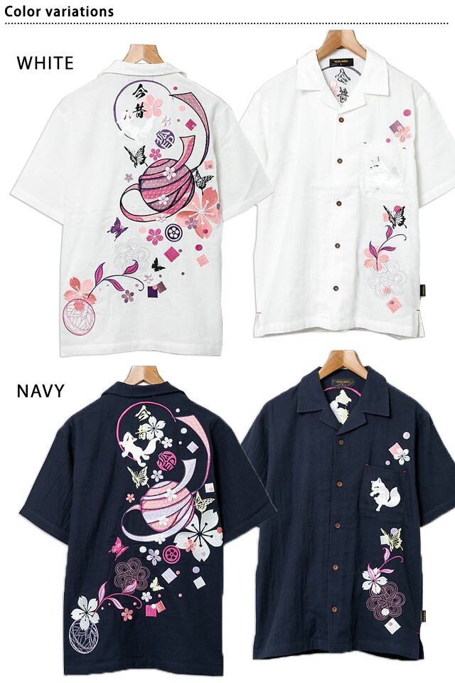 桜花爛漫開襟半袖シャツ 今昔 KJ-29265 和柄 和風 狐 きつね 刺繍 ユニセックス