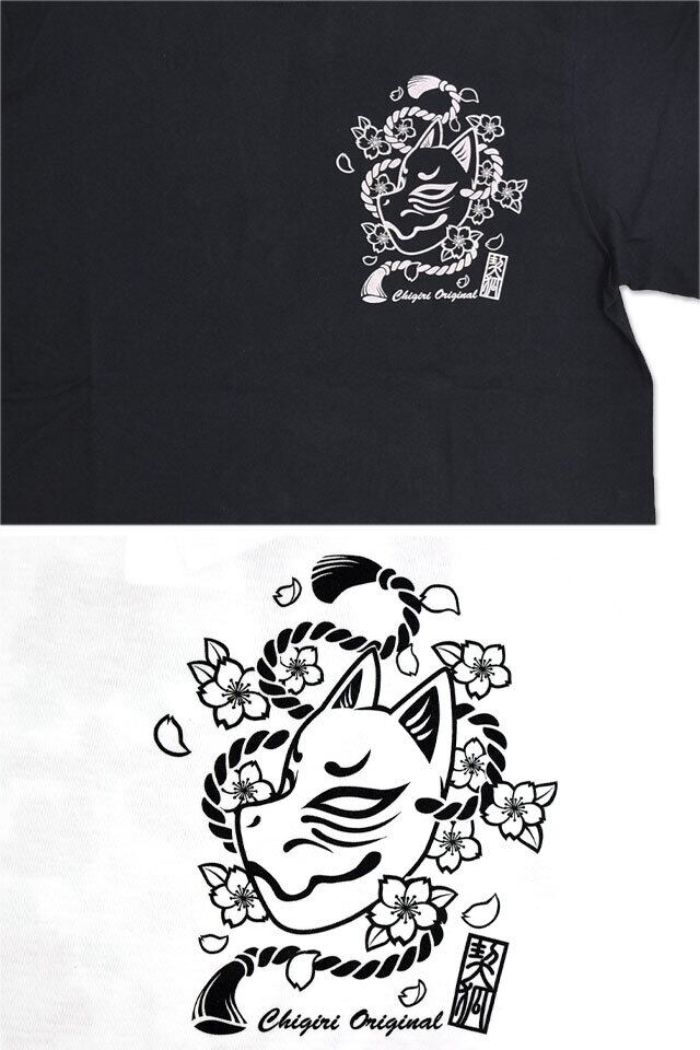 狐面割れ桜 刺繍風インクジェットプリント半袖Tシャツ CHIGIRI CHS63-592 チギリ ちぎり 和柄 和風 キツネ きつね
