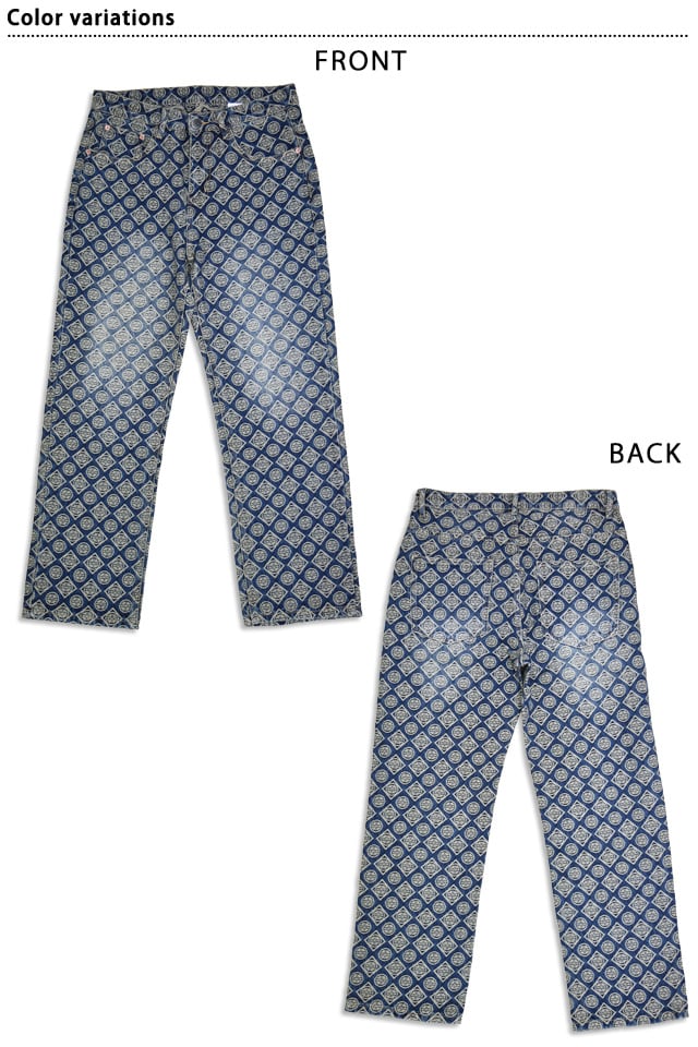 家紋をジャガード織りで落とし込んだ、総柄のデニムパンツです。