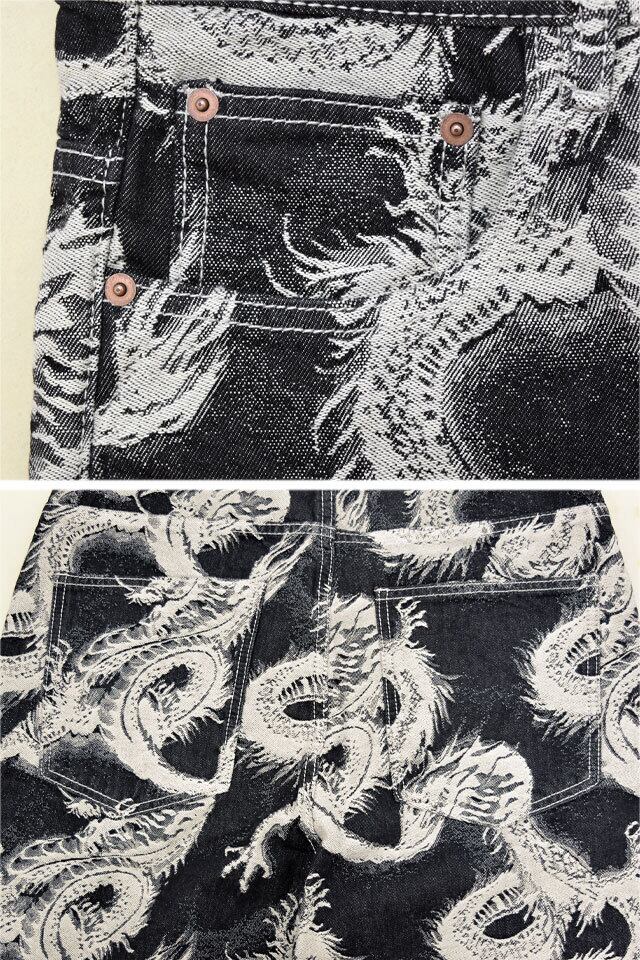 白龍をジャガード織りで落とし込んだ、総柄のデニムパンツです。