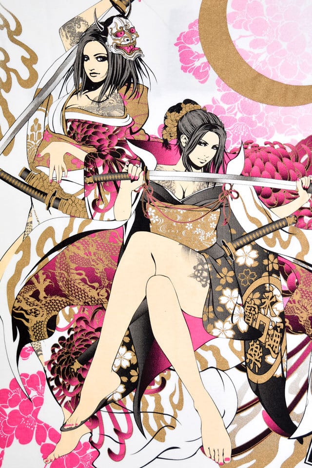 背中には刀を構えた二人の娘の美しい姿をダイナミックにプリントしました。