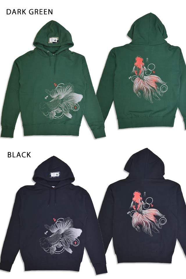 着た人、それを見た人が笑顔になれる、他にはないデザインを提供し続けている「喜人」さんから「金魚の厚手裏毛プルパーカー(KJ-52301)」のご紹介です。