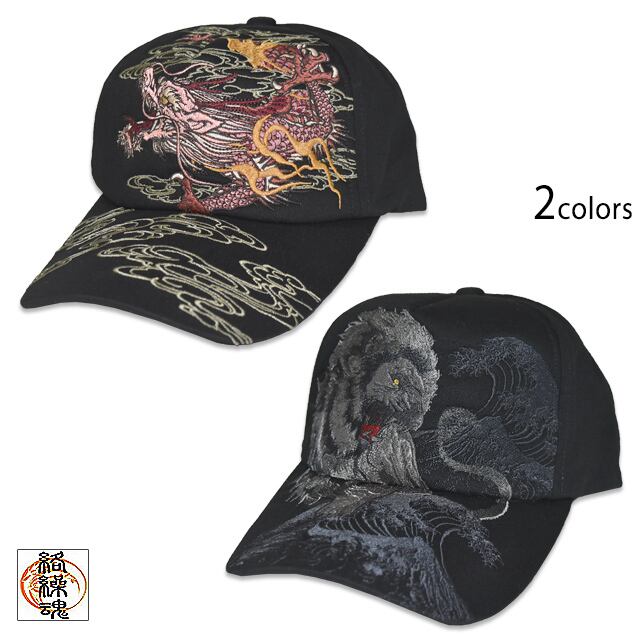 和柄刺繍ツイルキャップ 絡繰魂 254804 帽子 龍 竜 ドラゴン ライオン 獅子 からくり