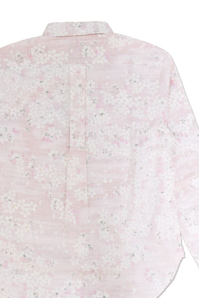 ピンクの桜柄の生地を敢えて裏返し、使用することで、柔らかいカラーリングの長袖シャツに仕上がりました。