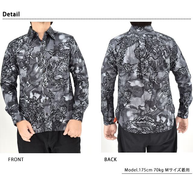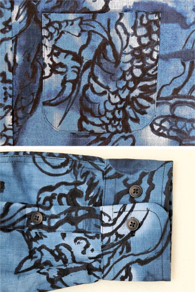 ムラ染め抜染調長袖レギュラーカラーシャツ「老龍」 衣櫻 SA-1750 和柄 和風 総柄 日本製 国産 竜 ドラゴン