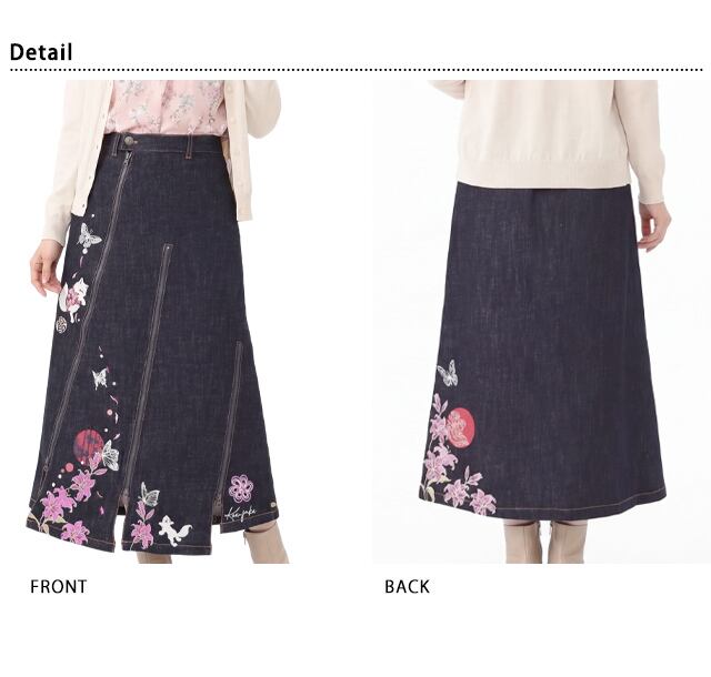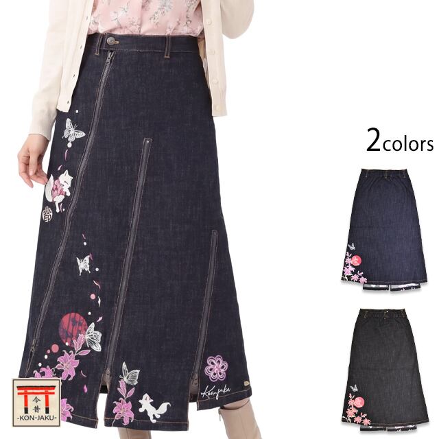 着物狐と百合斜めジップスカート 今昔 レディース KJ-29281 和柄 和風 キツネ きつね デニム こんじゃく
