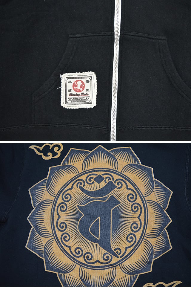 元気いっぱいの走りサルをメインキャラクターに、バリエーション豊富なアイテムを展開し続ける【GO-COO!!】さんから、「悟空猿梵字スウェットパーカー(GSJP-8260)」のご紹介です。